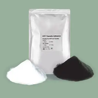 We offer both white DTF powder for standard applications and black DTF powder for anti-sublimation, ensuring excellent opacity and preventing dye migration on dark or sublimated fabrics.